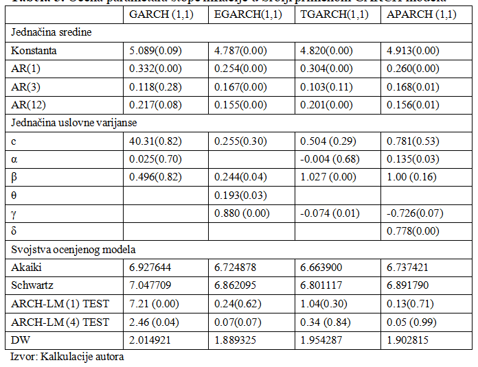 Tabela 3. Ocena parametara stope inflacije u Srbiji primenom GARCH modela