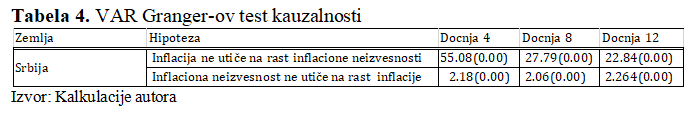 , koja pretpostavlja da inflacija ne utiče na neizvesnost. Odbacivanje ove hipoteze znači prihvatanje Friedman-Ball-ove hipoteze. Testiranje primenom Granger-ovog testa je izvršeno za 4, 8 i 12 docnju.