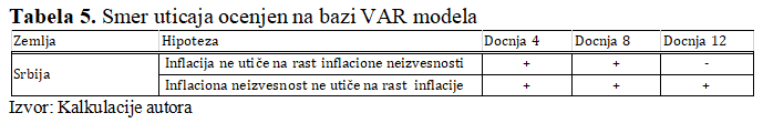 Rezultati prikazani u tabeli (5.) pokazuju da porast inflacije utiče na rast inflacione neizvesnosti. Pored toga rezulati pokazuju da rast inflacione neizvesnosti utiče na porast inflacije.