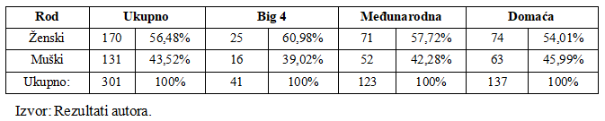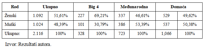 2.116 revizorskih izveštaja, analiziranih prema vrsti angažovanog revizorskog društva i roda potpisnika revizorskog izveštaja. U tabeli u nastavku prikazano je da je gotovo jednak broj revizorskih izveštaja potpisan od strane revizora muškog i ženskog roda. Kada je reč o međunarodnim i domaćim revizorskim društvima, zanimljivo je to da su dobijene vrednosti gotovo jednake, pri čemu je primećeno da revizorska društva koja pripadaju Velikoj četvorci (Big 4) imaju veći broj revizorskih izveštaja potpisanih od strane revizora ženskog roda (oko 70%). Ukupno posmatrano, razlika je gotovo neprimetna, s obzirom na to da 85% ukupnih revizorskih izveštaja potiče od međunarodnih i domaćih revizorskih društava.