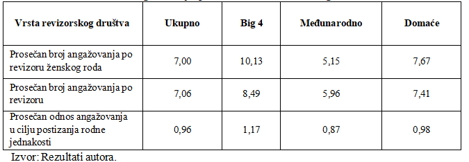 Rezultati istraživanja pokazuju da postoji prilično jednak broj angažovanih revizora oba roda, ali je ipak prednost na strani revizora ženskog roda. Kao što se očekivalo, domaća revizorska društva imaju najveći udeo u ukupnom broju angažovanih revizora (oko 46%), što je u skladu sa njihovim udelom u ukupnom broju obavljenih revizija (oko 50%). Velika i međunarodna revizorska društva imaju veći udeo revizora ženskog roda, dok je taj udeo približniji u domaćim revizorskim društvima. Na osnovu dobijenih rezultata, može se očekivati da su revizori ženskog roda češće angažovani za obavljanje revizija u posmatranim društvima. Međutim, kako bi se pomenuto potvrdilo, potrebno je izračunati odnos prosečnog broja angažovanja koje obavljaju revizori ženskog roda i ukupnog broja angažovanja po revizoru za svako revizorsko društvo u uzorku: