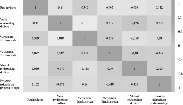 Takođe, rezultati iz prethodne tabele pokazuju da su sve korelacije između roda revizora i ostalih varijabli statistički značajne, sa vrednostima ispod 0,01. Kada je u pitanju drugo istraživačko pitanje, rezultati pokazuju da postoji slaba, ali pozitivna korelacija između roda revizora i prosečne naknade za pruženu uslugu. Dakle, može se zaključiti da su izveštaji koje potpisuju revizori ženskog roda dolazili od revizorskih društava sa višim prosečnim naknadama za reviziju.