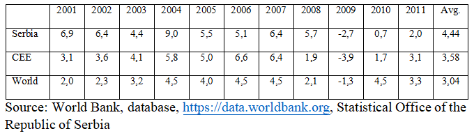 Table 1: GDP in Serbia, CEE and World from 2001 to 2011, annual growth rates in %
