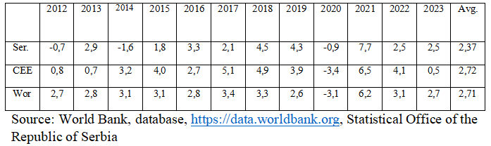 Table 2: GDP in Serbia, CEE and World from 2012 to 2023, annual growth rates in %