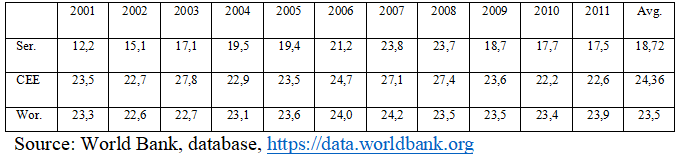 Table 3: Gross investments in Serbia, CEE and World from 2001 to 2011, as a part of GDP in %