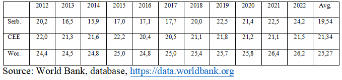 Table 4: Gross investments in Serbia, CEE and World from 2012 to 2023, as a part of GDP in %