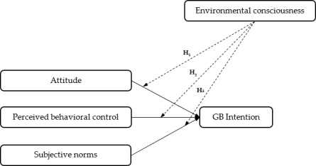 Pored UTAUT-a, primenjivana je i teorija planiranog ponašanja (TPB). Osim namere i ponašanja, ova teorija uključuje još tri varijable: stav prema ponašanju, subjektivne norme (percepcija društvenog pritiska o izvršavanju ili neizvršavanju ponašanja) i percipirana kontrola ponašanja (Ajzen, 1991). Pristup TPB već je korišćen u nekoliko studija za analizu namere kupovine i/ili ponašanja u vezi sa zelenim proizvodima i uslugama (Kamalanon et al., 2022; Liobikienė et al., 2016; Nimri et al., 2020; Ting et al., 2019; Vu et al., 2022; Wang, Wong, 2021; Yadav, Pathak, 2017). Na osnovu toga, Taneja i Ali (2021) istraživali su nameru kupaca prema ekološki održivim bankarskim uslugama. Pored stava, percipirane kontrole ponašanja i subjektivnih normi (kao glavnih determinanti namere ponašanja prema TPB), njihov model uključivao je još tri varijable (poverenje, percepcija ekoloških ishoda i ekološka svest).