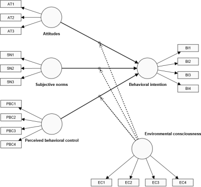 Naš statistički model (prikazan na slici 2) uključivao je nameru ponašanja (BI) kao nezavisni konstrukt; stav (AT), percipiranu kontrolu ponašanja (PBC) i subjektivne norme (SN) kao njegove glavne prediktore; i ekološku svest (EC) kao moderator.