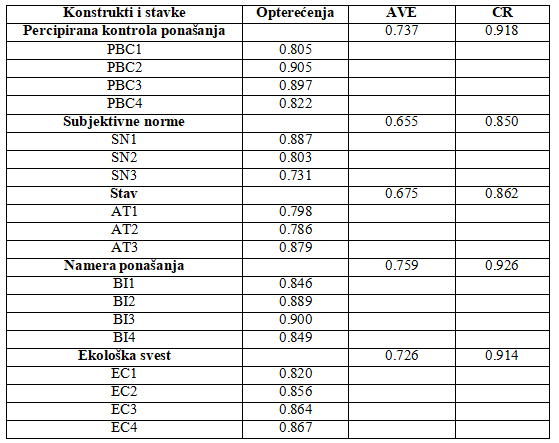 Svi reflektivni konstrukti (namera ponašanja, stav, subjektivne norme, percipirana kontrola ponašanja i ekološka svest) su testirani u pogledu pouzdanosti i validnosti. Ovi rezultati su prikazani u Tabeli 1.