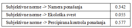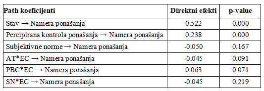 U slučaju glavnih prediktora TPB-a, zabeleženi su pozitivni efekti na nameru ponašanja za stav i percipiranu kontrolu ponašanja. Ovi efekti takođe su bili značajni sa p vrednošću manjom od 0,05. S druge strane, subjektivne norme su imale negativan uticaj na nameru ponašanja sa p-vrednošću većom od 0,05. Imajući u vidu da su sva tri koeficijenta dobijena u modelu koji uključuje moderatora, oni predstavljaju "proste efekte" i mogu se koristiti za tumačenje rezultata analize modulacije (Hair et al., 2017).