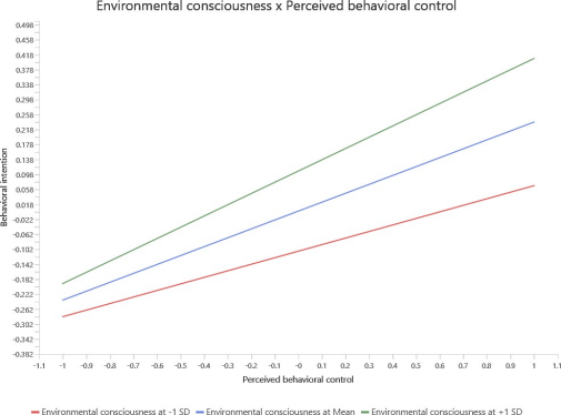 Što se tiče interakcija, dva od njih (AT*EC and SN*EC) negativno su uticala na nameru ponašanja, dok je efekat PBC*EC bio pozitivan. Međutim, njihove p- vrednosti bile su veće od 0,05, dok su za AT*EC i PBC*EC bile ispod 0,1. Dodatno, proverili smo da li su ova dva efekta suštinska, analizirajući njihove efekte veličine f2. Vrednost f2 premašila je donju granicu od 0,005 samo u slučaju interakcije PBC*EC. Budući da je iznosila 0,006, ovaj efekat je smatran slabim (Becker et al., 2023). Time, uz određeni stepen opreza, samo hipoteza H2 mogla bi biti potvrđena. Stoga, sledeći Hair et al. (2017), ako se prosečna vrednost svesti o životnoj sredini poveća za jedno standardno odstupanje (SD), odnos između PBC i namere ponašanja povećao bi se na vrednost od 0,301 (0,238 + 0,063). Ovo se takođe može videti na Slici 3, gde je zelena linija (ekološka svest na + 1 SD) strmija od plave linije (ekološka svest na srednjoj vrednost.