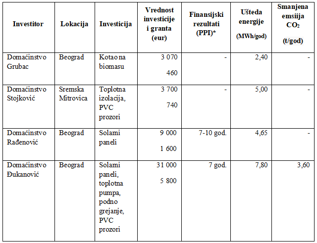 Investicije u pomenute tehnologije, omogućile su im da smanje potrošnju energije, uz održavanje uobičajene temperature i povećanje komfora. Uprkos nedostatku podataka o finansijskim efektima ostvarenih ušteda energije, može se zaključiti da postoje i značajne finansijske uštede u svim domaćinstvima usled smanjenja potrošnje energije. Primeri uspešnog investiranja u energetski efikasne tehnologije ovih domaćinstava i stambene zgrade mogu podstaći i druga domaćinstva i upravnike stambenih zgrada da koriste kredite za energetsku efikasnost i podsticaje EU za finansiranje visokih početnih troškova uvođenja ovih tehnologija. Na osnovu raspoloživih podataka 1/3 analiziranih domaćinstava o smanjenju emisije CO2 može se zaključiti da koristi od unapređenja energetske efikasnosti domaćinstva postoje i za društvo. U prilog tome je i činjenica da se u velikom broju domaćinstava promenio način grejanja - kotlovi na drva i ugalj zamenjeni su kotlovima na biomasu (pelet).