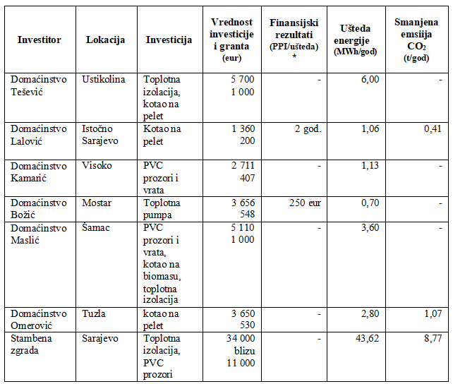 Tabela 2. Studije slučaja domaćinstava koja su koristila kredite za energetsku efikasnost u Bosni i Hercegovini