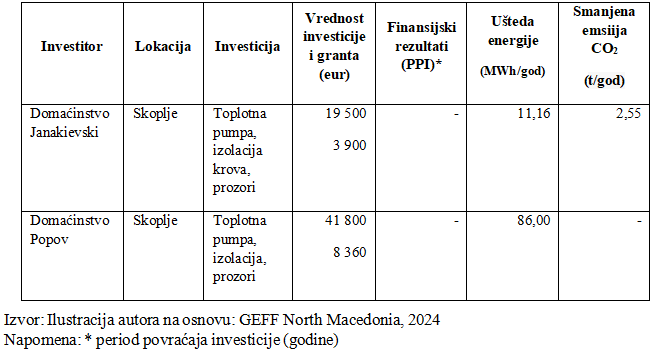 Domaćinstva koriste oko 40% ukupne električne energije u Severnoj Makedoniji (GEFF North Macedonia, 2020a). Od energetski neefikasnih zgrada potiče oko 40% emisija gasova sa efektom staklene bašte (GEFF North Macedonia, 2020). Potencijal za uštedu energije u domaćinstvima, finansijske uštede i smanjenja zagađenja životne sredine je veliki. Analizom studija slučaja u ovoj zemlji obuhvaćena su dva domaćinstva koja su koristila kredite za energetsku efikasnost i njima finansirala nekoliko energerski efikasnih tehnologija (Tabela 3.).