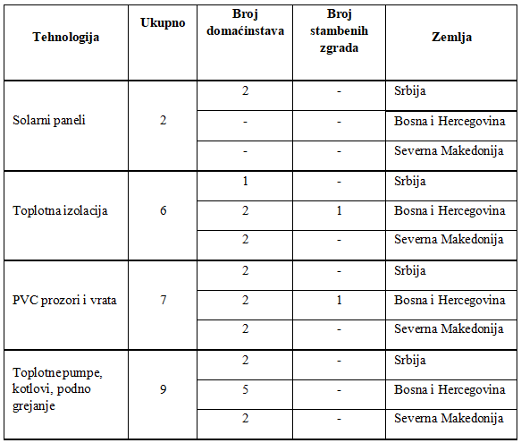 Za unapređenje energetske efikasnosti korišćene su različite tehnologije (Tabela 5.). Najveći broj domaćinstava promenio je način grejanja - kotao na drva ili ugalj zamenjen je kotlom na biomasu (pelet) ili toplotnom pumpom. U posmatranim zemljama bilo je 9 domaćinstava koja su koristila ove tehnologije. Slede tehnologije koja se odnose na ugradnju PVC prozora i vrata i toplotnu izolaciju, koje su, takođe, zastupljene u svim analiziranim zemljama. U 6 domaćinstava i 1 višespratnoj stambenoj zgradi stari prozori i vrata zamenjeni su PVC prozorima i vratima, pri čemu su ove tehnologije podjednako korišćene u domaćinstvima u svim zemljama. Tehnologije koje se odnose na unapređenje toplotne izolacije zidova i krovova korišćene su u 5 domaćinstava i 1 stambenoj zgradi. Solarni paneli su ugrađeni samo u 2 domaćinstva u Srbiji. U ostalim studijama slučaja nije bila zastupljena ova tehnologija.