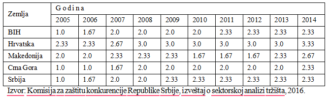 Tabela 1. Ocene Evropske Banke za obnovu i razvoj o sprovođenju politike o zaštiti konkurencije u zemljama bivše SFRJ