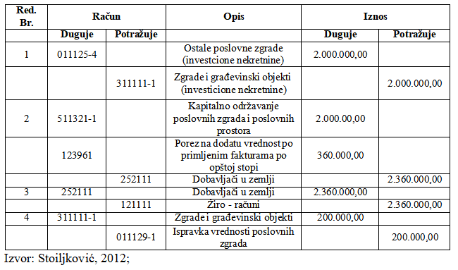Primer: Na zgradi je izvršeno ulaganje u iznosu od 2.000.000,00 dinara i taj iznos je iskazan kao investiciona nekretnina. Primljena je faktura od ivođača radova na iznos od 2.000.000,00 dinara i obračunat je PDV u iznosu od 360.000,00 dinara. Na kraju godine je utvrđena poštena vrednost investicione nekretnine od 1.800.000,00 dinara.