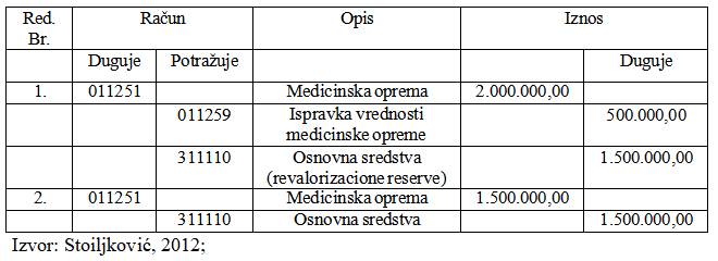 Primer: Bruto knjigovodstvena vrednost elektromagnetne rezonance pre revalorizacije je 10.000,00 dinara, ispravka vrednosti 2.500.000,00 dinara, a sadašnja vrednost 7.500.000,00 dinara.