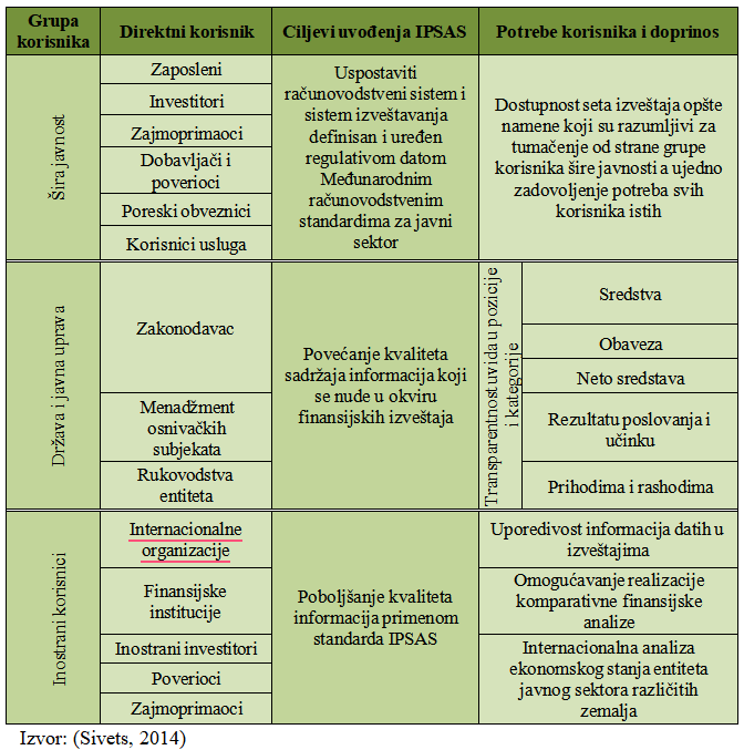 The level of implementation of IPSAS in the Republic of Serbia, within the public sector, is emphasized through research in the work, as well as the development and goals of establishing accounting regulations. The adoption of the IPSAS standard has allowed a higher degree of responsibility for mutually dependent and involved public sector actors, as well as state and entity governments with public revenue, better transparency, greater credibility, and overall better governance and planning, as well as faster and more rational management of programs, as and the universality of financial statements at the international level, for the purpose of better understanding and use of the information provided therein.