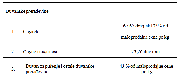 - duvanske prerađevine (cigarete, cigare, cigarilose, duvan za pušenje i ostale duvanske prerađevine). Cigaretama, cigarama, cigarilosima, duvanom za pušenje i ostalim duvanskim prerađevinama smatraju se duvanske prerađevine koje se proizvode i stavljaju u promet kao takva vrsta prerađevina u skladu sa zakonom kojim se uređuje proizvodnja i promet duvana i duvanskih prerađevina. Nesagorevajući duvan je posebna duvanska prerađevina svrstana u tarifnu oznaku nomenklature CT 2403 99 90 00 koja je sačinjena tako da se prilikom upotrebe zagreva ali ne sagoreva.