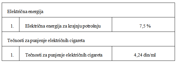 - tečnosti za punjenje elektronskih cigareta; Tečnostima za punjenje elektronskih cigareta, u smislu ZOA, smatraju se proizvodi iz tarifne oznake nomenklature CT 3824 99 92 90 koji prilikom korišćenja elektronske cigarete na predviđeni način stvaraju paru za udisanje, kao i tečnosti za punjenje elektronskih cigareta sadržane u drugim proizvodima koji se svrstavaju u tarifnu oznaku nomenklature CT 8543 70 90 90.