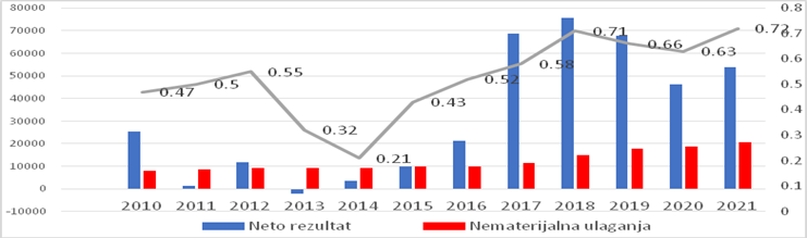 Sledeći, logički korak je analiza nematerijalnih ulaganja. Radi se o jedino javno objavljenim podacima o ulaganju u IT tehnologije, inovacijama i digitalizacijom, kao i upravljanje rizicima, ali su podaci ograničeni jer se radi o kumulativnim podacima o softverima i licencama. Rezultati istraživanja za period od 2010. do 2021. predstavljeni su grafički (Slika 1.).