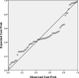 Dokazano je da pretpostavke normalnosti regresione analize nisu bile narušene. Tačke leže u približno pravoj dijagonalnoj liniji od donjeg levog do gornjeg desnog uglla dijagrama. Na osnovu dijagrama raspršenosti zaključujemo sledeće: po jačini kvantitativnog slaganja veza izmedju celokupne digitalne bankarske ponude i ostalih pretpostavki je statistička, prilicne jačine, zato što su tačke blizu zamišljenog pravca koji uvek prolazi kroz tačku. Po obliku je linearna, tačke su raspoređene približno zamisljenom pravcu, a po smeru direktna i pozitivna tj. sa rastom promenljivih dolazi do digitalne bankarske ponude. Za potrebe istraživanja na nivou zemlje moguće je identifikovati digitalnu zrelost klijenta.