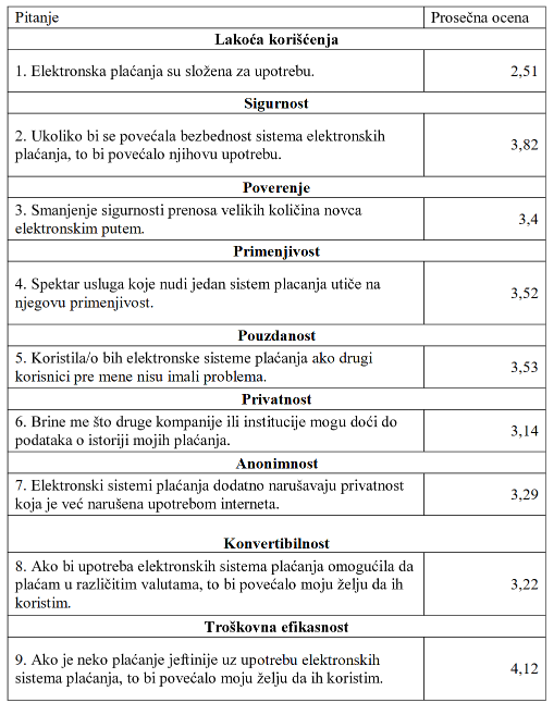 Da bi ukazali u kojoj meri su kupci u Republici Srbiji i zemljama regiona spremni da se preusmere na elektronska plaćanja, obavili smo istraživanje na uzorak od 100 ispitanika, gde smo do podataka došli elektronskim putem, metodom anketiranja. Vodilo se računa o podjednakoj zastupljenosti kupaca iz 5 zemalja, uključujući i Srbiju, različitih starosnih kategorija, nivoa obrazovanja i nivoa mesečnih primanja. U sledećoj tabeli su predstavljena pitanja na koja su pojedinci davali odgovore i prosečna ocena po pitanju.