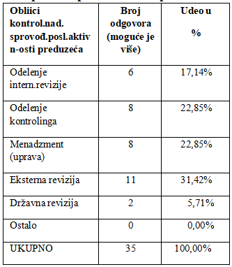 Da bi se postigao što veći stepen sigurnosti poslovanja, moguće je, a i poželjno je, koristiti više oblika nadzora nad preduzećem. Pri tome, nadzor može biti unutar samog preduzeća i može ga obavljati deo interne revizije, deo kontrolinga ili menadžment, odnosno uprava preduzeća. Izvan preduzeća, nadzor obavljaju eksterna revizorska preduzeća ili državna revizija. U tom smislu, jedna od relevantnih informacija je: koje oblike nadzora koriste anketirana preduzeća?