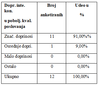 Na osnovu datih odgovora primećujemo kako većina anketiranih preduzeća smatra da interna kontrola značajno doprinosi poboljšanju kvaliteta poslovanja. Čak 75% preduzeća, odnosno njih 9, odlučilo se za taj odgovor. Samo 16,66% anketiranih preduzeća smatra kako je taj doprinos osrednji, dok 8% smatra kako je doprinos zanemarljiv. Ovakvi rezultati su ohrabrujući i govore o tome da, iako se sva anketirana preduzeća oslanjaju na eksterne oblike nadzora, značajan broj anketiranih preduzeća internu kontrolu shvata kao važan deo poslovanja koji omogućuje uspešnije rezultate i napredak celokupnog preduzeća.
