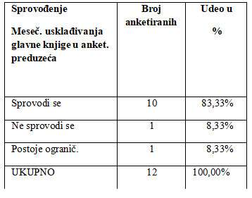 Imajući u vidu činjenicu da je glavna knjiga bazična poslovna knjiga u koju se hronološki unose svi poslovni događaji, relevantan je i podatak da li se u anketiranim preduzećima sprovode mesečna usklađivanja računa glavne knjige kako bi se izbegle nepravilnosti i moguće greške.
