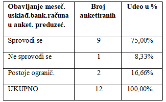 Prema tabeli 5. moguće je dobiti sliku o sprovođenju mesečnih usklađivanja bankovnih računa u anketiranim preduzećima. Tako se od ukupnog broja anketiranih poduzeća, njih 9, odnosno 75,00% izjasnilo kako redovno obavljaju mesečna usklađivanja bankovnih računa.