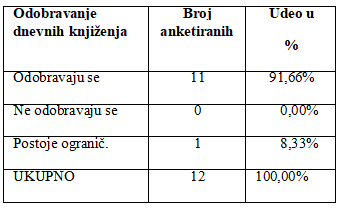 Iz tabele 6 je vidljivo kako 11 od 12 ankeiranih preduzeća odobrava dnevna knjiženja, odnosno vrlo su ažurna u evidenciji poslovnih događaja. Samo jedno anketirano preduzeće ne odobrava takvu vrstu knjiženja, ali to bi se moglo opravdati njegovom veličinom i prirodom njegove delatnosti.