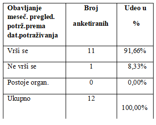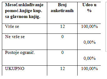 Iz tabele 7 vidimo kako sva anketirana preduzeća sprovode mesečno usklađivanje pomoćne knjige kupaca i glavne knjige i u skladu sa tim može se zaključiti kako sva anketirana preduzeća vode izuzetnu brigu od trenutnim stanjima konta kupaca.