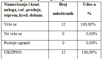 Analizom prikupljenih odgovora uvidelo se kako sva anketirana preduzeća sprovode numeriranje i kontrolisanje naloga, računa prodaje, otpremnica i kreditnih dokumenata, pa se prema tome može zaključiti kako sva posmatrana preduzeća vode izrazitu brigu o odnosu s kupcima i pažljivo sprovode kontrolu nad otpremom robe i prateće dokumentacije.