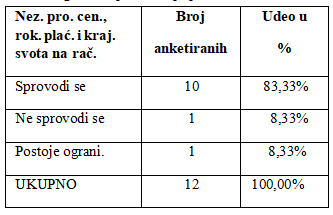 Iz podataka datih u tabeli 12 može se uočiti da 83,33% anketiranih preduzeća sprovodi nezavisnu proveru cena, rokova plaćanja i krajnjih svota na računima i taj broj korenspondira broju preduzeća koja su odgovorila da potvrde neki oblik internog nadzora, i konkretnije kontrole. Jedno anketirano poduzeće je navelo kako takve postupke ne sprovodi, a drugo pak kako ovaj podatak nije primjenjiv, što je u ovom slučaju uslovljeno prirodom delatnosti preduzeća.