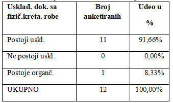 Na anketno pitanje da li u anketiranim preduzećima postoji usklađenosti dokumentacije sa fizičkim kretanjem robe došlo se do sledećih pokazatelja: