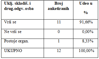 Od ukupno 12 ispitanika, 91,66% odnosno njih 11 se izjasnilo kako uz skladištare i odgovorne osobe, u proces praćenja i beleženja zaliha su uključene i druge osobe u poduzeću. Samo 1 ispitanik tvrdi kako informacija nije primenjiva na preduzeće, što opet upućuje na prirodu delatnosti.