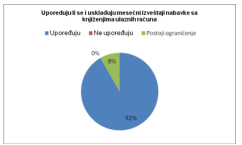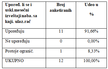 U anketi je bilo postavljeno i pitanje da li se u preduzećima upoređuju i usklađuju mesečni izveštaji nabavke sa knjiženjima ulaznih računa. Ovakav pristup upućuje na međusobnu saradnju delova i pojedinih funkcija preduzeća, što je od posebne važnosti kako bi se smanjili rizici poslovanja i kako bi se njima što efikasnije upravljalo.