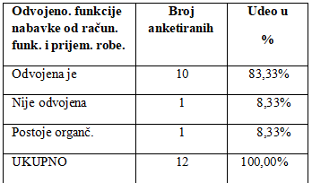 Kako bi se bolje razlučile obveze prema dobavljačima od ostalih funkcija, važno je pratiti i sam tok ulaska dobavljačevih dobara u preduzeće. Stoga su ispitanici kao jedno od pitanja na koje su trebali odgovoriti i to da li je funkcija nabavke odvojena od računovodstvene funkcije i prijema robe.
