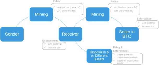 Na slici broj 3. su prikazani oporezivi događaji iz cirkulacije kriptovalute po metodologiji MMF-a — koja se ovde uzima kao Bitcoin (BTC)—, naglašavajući njihovu posebnu poresku politiku i administrativne izazove. Pošiljalac, preko rudara, kupuje uslugu od primaoca koristeći BTC, a primalac ima opcije da raspolaže BTC-om ili da kupi uslugu sa BTC-om. Simbol “?” ukazuje na posebnu potrebu za jasnoćom politike/zakona(Kelly et al., 2017).