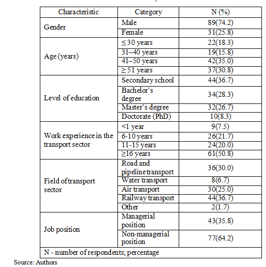 The research was conducted in the first half of 2025. A total of 120 respondents participated in this study, of whom 89 (74.2%) were male and 31 (25.8%) were female. The largest proportion of respondents was aged 41-50 years (42; 35.0%) and over 51 years (37; 30.8%). There were 22 respondents (18.3%) younger than 30 years, while 19 respondents (15.8%) were aged 31-40 years. Regarding education, most respondents had completed secondary school (44; 36.7%), followed by a bachelor’s degree (34; 28.3%) and a master’s degree (32; 26.7%), whereas 10 respondents (8.3%) held a doctorate (PhD). In terms of work experience in the transport sector, the majority had worked for 16 years or more (61; 50.8%), followed by 6-10 years (26; 21.7%) and 11-15 years (24; 20.0%), while the smallest group consisted of respondents with less than one year of experience (9; 7.5%). With respect to the field of transport, most respondents were employed in railway transport (44; 36.7%) and in road and pipeline transport (36; 30.0%), followed by air transport (30; 25.0%). Water transport accounted for 8 respondents (6.7%), while 2 respondents (1.7%) worked in other sectors. As for job positions, the majority of respondents were employed in non-managerial positions (77; 64.2%), while 43 respondents (35.8%) held managerial positions. Socio-demographic and professional characteristics of respondents are presented in Table 1.