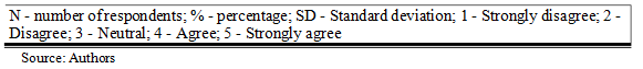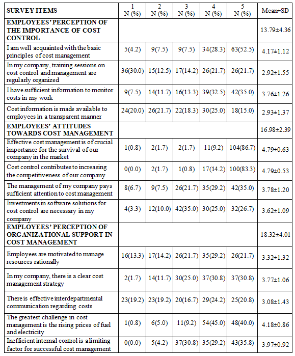 Within the subscale Employees’ attitudes towards cost management, the mean total score was 16.98±2.39 (maximum 20), indicating a high level of agreement among respondents. The two highest-rated statements were “Effective cost management is of crucial importance for the survival of our company in the market” (4.79±0.63) and “Cost control contributes to increasing the competitiveness of our company” (4.79±0.53), both of which reflect employees’ strong recognition of cost management as a key factor for business survival and competitiveness. Lower scores were observed for the statements “The management of my company pays sufficient attention to cost management” (3.78±1.20) and “Investments in software solutions for cost control are necessary in my company” (3.62±1.09). These results show that employees recognize the strategic role of cost management but are less convinced that management gives it enough priority or invests in tools such as software solutions.