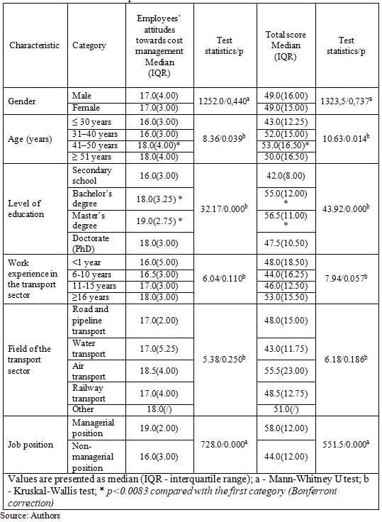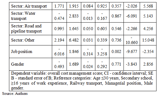 Differences in the overall cost management score and the subscale Employees’ attitudes towards cost management were analyzed across demographic and professional characteristics. No significant gender differences were observed. Significant differences were found by age, showing the highest values among respondents aged 41-50 years and the lowest among those aged ≤30 years. Education level showed a clear upward trend, with significantly higher scores among respondents with bachelor’s or master’s degrees compared to those with secondary education. Work experience tended to be associated with higher scores in those with ≥16 years, but the differences were not significant. No significant differences were observed between transport sectors. In contrast, job position was significantly associated with both outcomes, with managerial staff reporting higher values compared to non-managerial employees. Results are presented in Table 4.