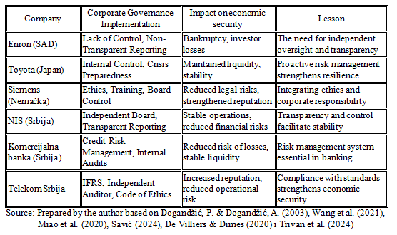 Practical examples from real business environments clearly illustrate the strong connection between the quality of corporate governance and the level of economic security of a company. When a company does not have adequate and effective supervision, as well as a high degree of transparency in its business processes, it becomes exposed to significant financial losses and potential damage to its reputation, which can seriously threaten its long-term stability and sustainability(Milanović, 2023). On the other hand, the implementation of modern corporate governance standards, including well-defined internal procedures and control mechanisms, significantly reduces operational and strategic risks, strengthens the organization's resilience to crisis situations and increases the trust of both investors and the general public.