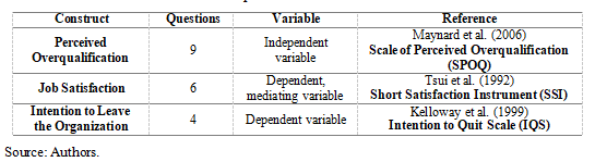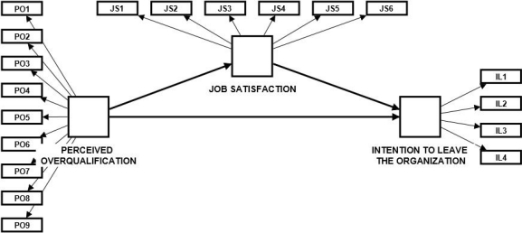 Given the insufficient empirical evidence and many unanswered questions related to this issue, the research direction and aim of the paper were established. The intent was to investigate the relationship between employees’ perceived overqualification and intention to leave the organization, as well as the eventual mediating effect of job satisfaction within it. All this is done through a concrete analysis of the effects of perceived overqualification on the attitude/behavioral intentions of national workers employed in the territory of the Republic of Serbia. The exploratory model depicted perceived overqualification as an independent variable, whilst job satisfaction and intention to leave the organization were framed as dependent variables.