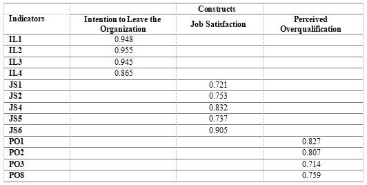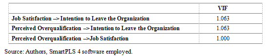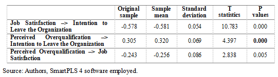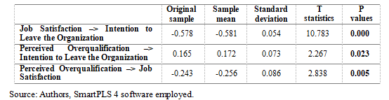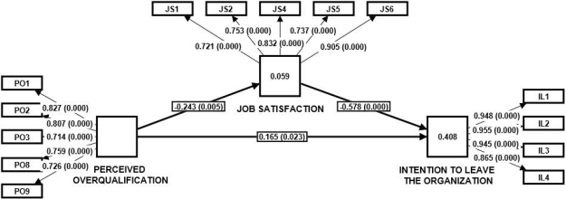 The final critical step in evaluating the structural research model involves assessing the total effects registered (Table 10). Total model effects are consistent with previous results, and once again confirm the set research hypotheses (by observing the entire model effects, it is possible to conclude that the effect on the relation Perceived Overqualification ‒> Intention to Leave the Organization is strengthened – p value changed from 0.023 to 0.000).