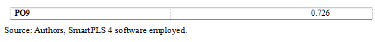 Outer Loadings for reflecting indicators are shown at the beginning of the overview with the aim of estimating their reliability. The criterion is established at a minimum of 0.708 for each indicator’s value, implying that if the indicator reaches a prescribed value, a particular research construct explains over 50% of the variance within that indicator (Hair et al., 2019; Jolović, Jolović, 2022; Jolović, Jolović, 2023).