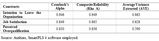 Table 3. Verification of constructs’ internal consistency reliability and convergent validity