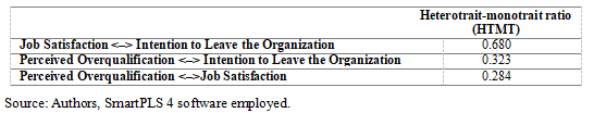 Additionally, using the Average Variance Extracted (AVE) metric, the convergent validity of each construct measure is assessed. The criterion is established at a minimum of 0.50, implying that if the prescribed value is obtained, constructs are capable of explaining no less than 50% of the variance within their associated items (Hair et al., 2019; Jolović, Jolović, 2022; Jolović, Jolović, 2023).